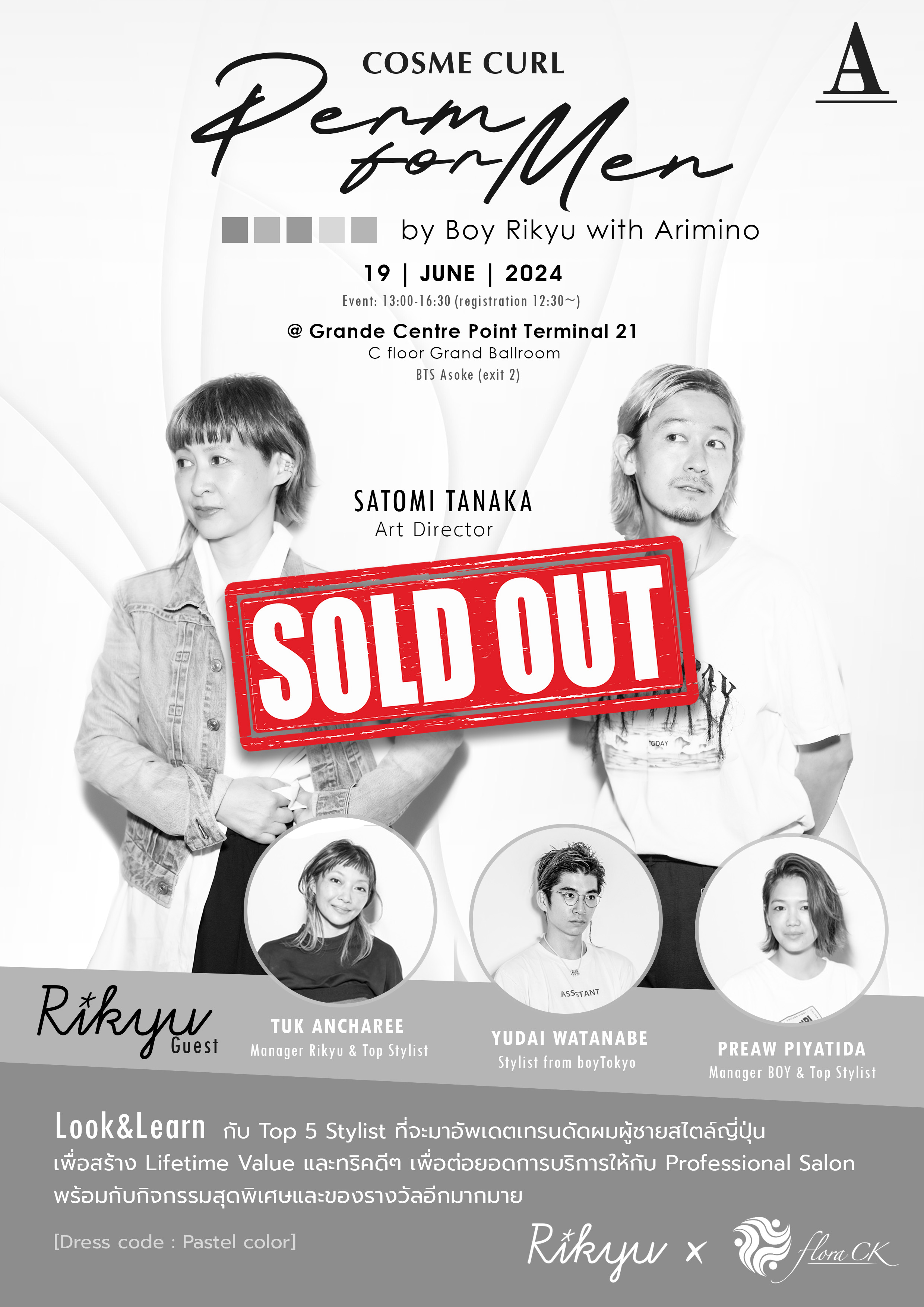 ในวันที่ 19 มิถุนายน 2024 – ขอเชิญชวนช่างทำผมมืออาชีพมาร่วมงานสัมมนา "Cosme Curl: Perm for Men by Boy Rikyu with Arimino" ที่ Grande Centre Point Terminal 21, C floor Grand Ballroom (BTS อโศก ทางออกที่ 2)