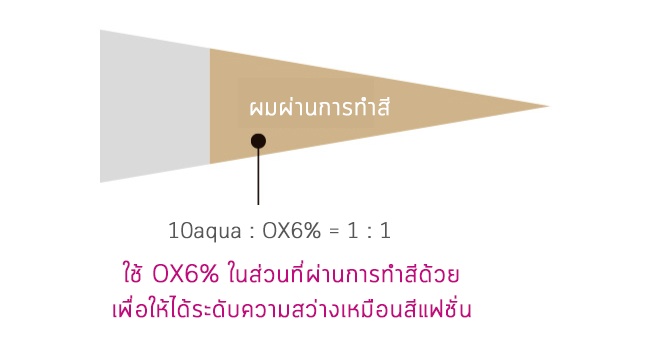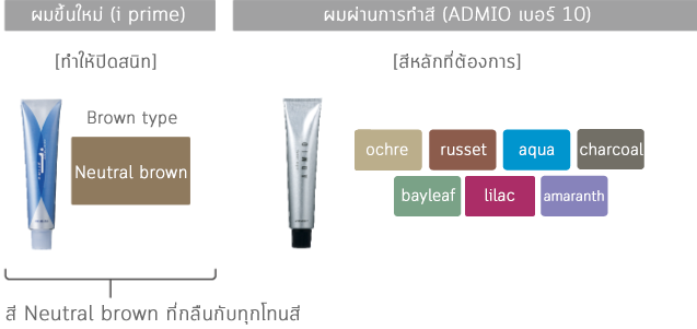 ใช้ "color story i prime" เพื่อปิดผมขาวช่วงโคน ส่วนช่วงที่เคยผ่านการทำสีแล้วใช้ "color story ADMIO" เบอร์ 10 เพื่อให้เห็นประกายสี