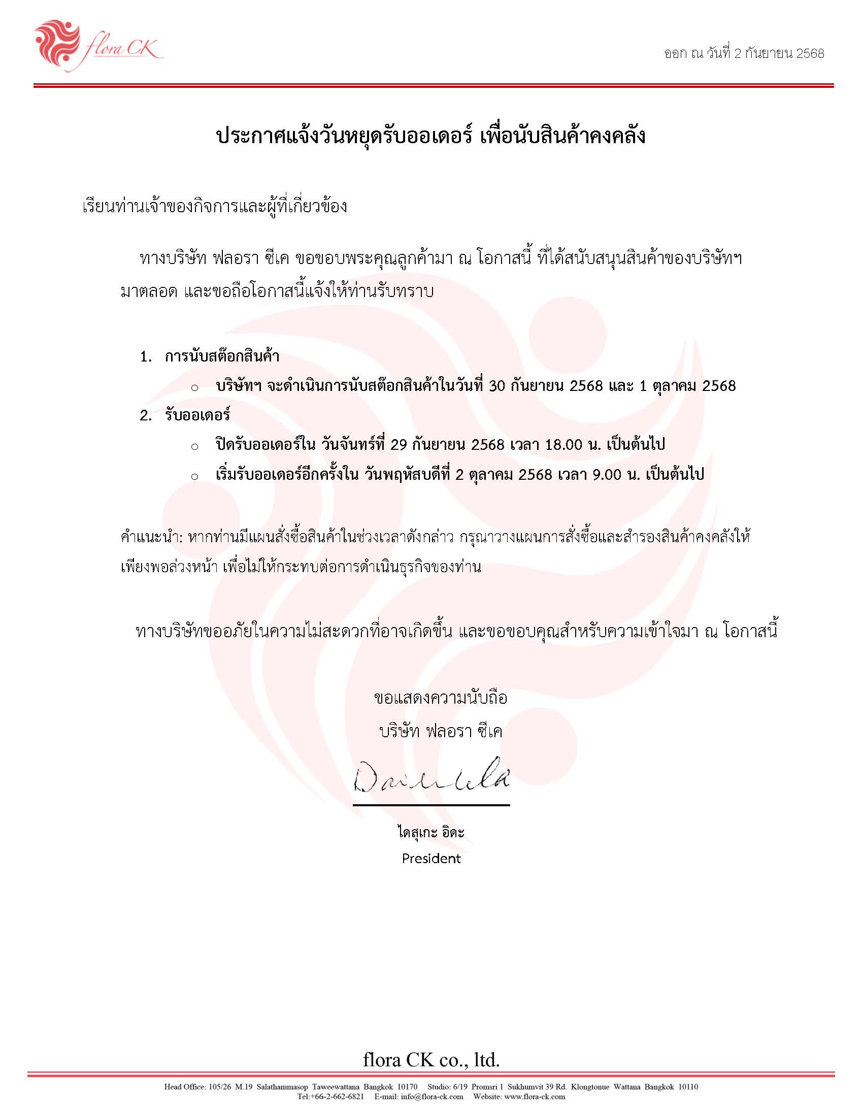 ประกาศวันหยุดรับออเดอร์เพื่อนับสินค้าคงคลัง - ฟลอรา ซีเค (กันยายนและตุลาคม 2568)